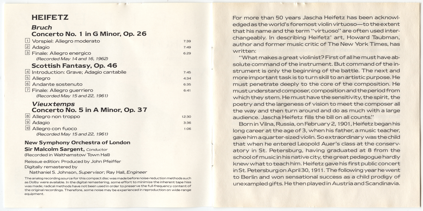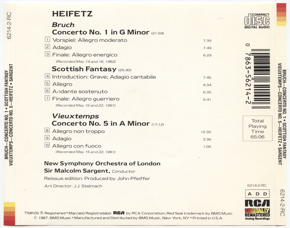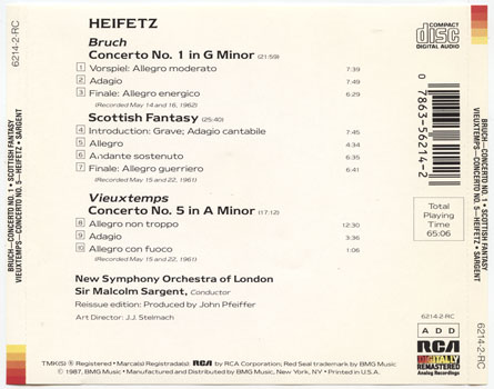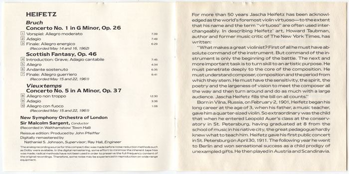 Heifetz, Jascha : Bruch: Violin Concerto No. 1, Scottish Fantasy; Vieuxtemps: Violin Concerto No. 5 (V001)